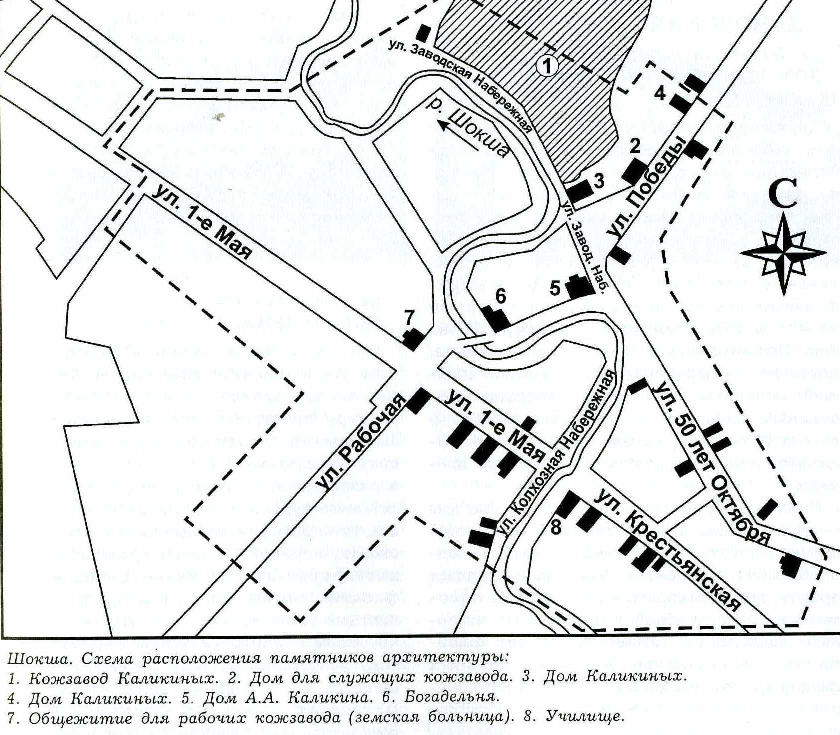 | | Шокша. Схема расположения памятников истории и культуры1. Кожзавод Каликиных. 2. Дом для служащих кожзавода. 3. Дом Каликиных. 4. Дом Каликиных. 5. Дом А.А. Каликина. 6. Богадельня. 7. Общежитие для рабочих кожзавода (земская больница). 8. Училище. |