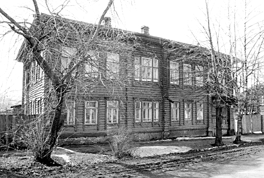 | | Усадьба,кон. XIX – нач. XX в.Адрес Дом представляет собой хороший пример довольно крупного для города доходного дома периода эклектики. Здание поднято на кирпичном цоколе, рублено из бревен и обшито тесом под руст. Прямоугольный в плане объем, завершенный вальмовой кровлей, сильно вытянут по красной линии улицы. Со стороны двора к нему примыкают пристройки хозяйственных помещений и ретирад. Главный фасад разделен рустованными лопатками на четыре прясла. В первом и третьем по три оси прямоугольных окон обычных пропорций, во втором — широкое трехчастное окно, в четвертом (на правом фланге) — сблокированные входы на этажи и окно, освещающее лестничную клетку. Наличники всех окон, включая трехчастные, выполненные в технике пропильной резьбы, имеют несложные фартуки, рисунок которых свидетельствует о некотором влиянии модерна, и скромные сандрики, дополненные узкими зубчатыми подзорами, а во втором этаже — резными коронами. Двухэтажный бревенчатый сарай рублен из бруса в лапу. Его прямоугольный в плане объем под односкатной кровлей обращен к дому продольным фасадом, перед которым на всю длину устроена двухъярусная галерея с деревянными столбами и ограждением во втором ярусе. Лит. и ист.: Памятники архитектуры Костромской области. Вып. 3. Кострома, 2001. С. 60. Данные государственной охраны Категория охраны: объект, предлагаемый к включению в список выявленных объектов культурного наследия |