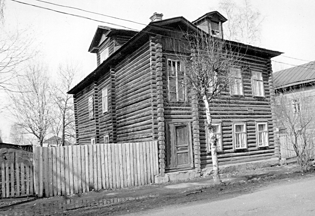Своеобразный пример деревянного жилого дома, в асимметричной композиции которого ощущается влияние модерна. Поднятый на низком кирпичном оштукатуренном цоколе двухэтажный почти квадратный в плане объем, рублен из бревен в обло. Справа к нему примыкает более поздняя пятигранная пристройка сеней, рубленных в лапу. Выразительность облику здания придает усложненная форма завершения: вальмовую кровлю с широким выносом карниза прорезает продольный мезонин, выходящий окнами на боковые фасады, и слуховое чердачное окно по центру уличного. Переруб делит главный фасад на две части: в правой находятся три оси прямоугольных окон в простых рамочных наличниках, в левой, отмеченной треугольным фронтоном с разорванной горизонталью карниза, — входная дверь; над ней вертикальное окно, освещающее лестничную клетку.