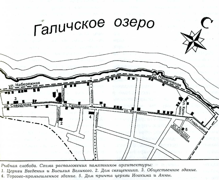 | | Рыбная слобода. Схема расположения памятников истории и культуры1. Церкви Введения и Василия Великого. 2. Дом священника. 3. Общественное здание. 4. Торгово-промышленное здание. 5. Дом причта церкви Иоакима и Анны |