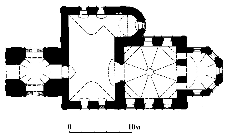 | | Храмовый комплекс: церкви Введения и Василия Великого, 2-я пол. XVIII в., сер. XIX в.Адрес Свердлова, ул, д. 20, лит. а Комплекс расположен в центральной части Рыбной слободы. Обширный церковный участок с северо-западной стороны ограничен Набережной ул., идущей по берегу Галичского озера, а с юго-восточной — главной магистралью слободы, ул. Свердлова. Особенностью постановки храмов является ориентация их алтарей, сильно смещенная к югу. Близкие по размеру здания поставлены параллельно друг другу (Васильевская церковь чуть смещена к ул. Свердлова), колокольня Васильевской церкви служит высотной доминантой прилегающего района и играет огромное значение в панораме города с озера. Церковь Василия Великого — хороший пример приходского храма в формах барокко с характерной для Галичского района объемной композицией. Компактный двусветный четверик увенчан пятью небольшими луковичными чешуйчатыми главками с тонкими шейками на цилиндрических барабанах. Центральный световой барабан поставлен в вершине высокой восьмилотковой кровли гуськового профиля, боковые — гораздо ниже, на углах объема. Невысокая граненая апсида с маленькой главкой на пятилотковой кровле по высоте равна короткой трапезной, объединенной с северным приделом, полукруглый алтарь которого частично прикрывает четверик храма. С запада композицию завершает колокольня, состоящая из двухъярусного четверика и стройного восьмигранного столпа с площадкой звона под стройным шатром с тремя рядами слухов. Углы четверика подчеркнуты гладкими лопатками, огибающие лопатки отмечают также ребра алтарного выступа и углы трапезной и придела. Карниз четверика, выполненный нависанием рядов кладки с легкой подтеской, дополнен удлиненными двухступенчатыми консольками, в карнизы апсиды и трапезной введена полоса поребрика. Все окна — с лучковыми перемычками, отмеченными небольшими замковыми камнями со скругленным верхом, типичными для архитектуры барокко. Однако вдавленные обводы оконных амбразур и пояски-перехваты на полуколонках, опирающихся на профилированные подоконники и несущих треугольные фронтончики, по характеру близки к петровскому времени. Интересным элементов убранства колокольни являются пучки полуколонок, украшающие второй ярус четверика, основания и опоры арок звона. Углы нижнего яруса рустованы. Внутри четверик с поздним междуэтажным перекрытием завершен восьмилотковым сводом на двухступенчатых тромпах с закрытым позже световым кольцом в шелыге. Три арки ведут в алтарь, перекрытый коробовым сводом, замкнутым с востока тремя лотками. Трапезная перекрыта поперечным лотковым сводом с распалубками над проемами, в нижнем ярусе колокольни восьмилотковый свод. На своде четверика сохранилась клеевая живопись кон. XVIII в., прописанная маслом в сер. XIX в., когда появились также тянутый карниз и профилированные тяги по ребрам свода. Тема росписи — сотворение мира. В каждом лотке изображена фигура бога-демиурга, свершающего акт творения. На тромпах были написаны евангелисты (сохранились фрагментарно). Небольшие композиции над окнами второго света относятся к сер. XIX в. Все они заключены в тянутые филенки, круглые и в виде арочки с плечиками. Церковь Введения — характерный для своего времени приходский храм, в формах которого черты плоскостного провинциального 
