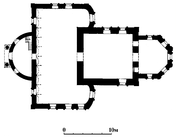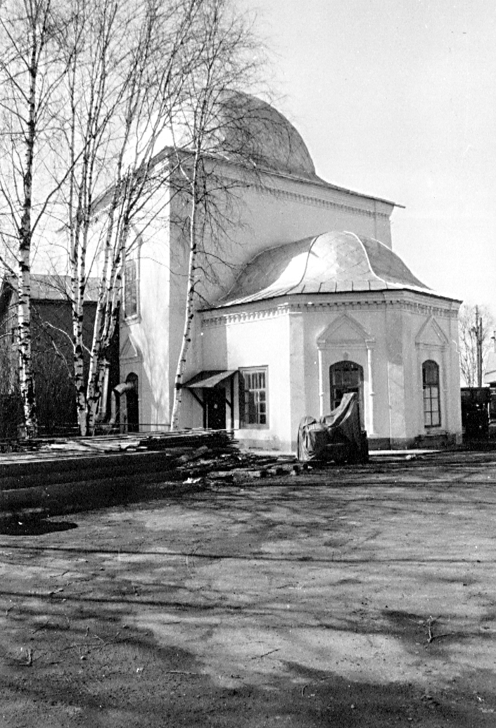 | | Церковь Константина и Елены,сер. XVIII в., 1-я треть XIX в.Адрес Храм стоит в глубине участка, расположенного у пересечения ул. Красноармейской и Ленина. Ориентация алтаря сильно смещена к северу. Кубовидный двусветный четверик завершен высокой купольной кровлей с полицей, пятигранный алтарь имеет полусферическую кровлю. Полукруглые алтари боковых приделов надстроенной трапезной частично прикрывают боковые фасады четверика. Полукруглый западный притвор значительно понижен. Углы объемов подчеркнуты гладкими огибающими лопатками. Первоначальные ступенчатые карнизы четверика и апсиды дополнены ступенчатыми консольками, карниз трапезной — поясом из мелких квадратных впадин. Окна четверика с лучковыми перемычками, отмеченными миниатюрными замками, размещены в две оси и несколько смещены к востоку. Они заключены в наличники, несколько архаичные для своего времени: тонкие колонки с перетяжкой опираются на профилированный подоконник и несут карниз с треугольным фронтоном. Вход в притвор отмечен двухколонным портиком, первоначально венчавшимся треугольным фронтоном. Внутри храм, в четверике которого сделано междуэтажное перекрытие, сохранил своды: в основном объеме восьмилотковый, опирающийся в углах на двухступенчатые тромпы, а в алтаре коробовый с граненой конхой. Трапезная перекрыта сводами Монье, в притворе — плоский потолок. Лит. и ист.: Беляев И. Статистическое описание соборов и церквей Костромской епархии. СПб, 1863. С. 69; Известия императорской археологической комиссии. СПб, 1909. Вып. 31. С. 157. Рис. 90; Баженов И.В. Краткие статистические сведения о приходских церквах Костромской епархии. Кострома, 1911. С. 73; Храмы Галича // Губернский дом. Кострома, 2000. № 2 (39). С. 40; Памятники архитектуры Костромской области. Вып. 3. Кострома, 2001. С. 67-68; Рудченко В.М., Щеболева Е.Г. Галичская земля в старых фотографиях. Кострома, 2008. С. 56-57. Персоны Баженов И. Беляев В. Постниковы Данные государственной охраны Категория охраны: объект культурного наследия регионального значения Название по постановлению: Церковь Константина и Елены Датировка по постановлению: 1754-1770 гг. Постановление: Постановление главы администрации Костромской области от 30.12. 1993 г. № 598 «Об объявлении находящихся на территории Костромской области объектов, имеющих историческую, культурную и научную ценность, памятниками истории и культуры», приложение 1 |