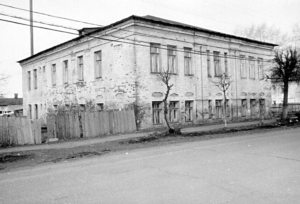 Двухэтажный кирпичный дом в стиле классицизма принадлежит к числу наиболее ранних построек улицы. Особенности композиции и декора позволяют предположить, что первоначально здание имело над средней частью главного фасада мезонин с арочной лоджией, которая опиралась на две пары колонн. В таком случае это был еще один пример характерного для Галича типа представительных домов 1-й четв. XIX в., строительство которых по традиции связывают с пленными французами (см., например, ул. Луначарского, 39, ул. Леднева, 2). По сведениям краеведов, в здании располагалась богадельня Варваринской церкви. Прямоугольный в плане объем, вытянутый вдоль красной линии застройки, завершен двускатной кровлей с крупной вальмой со стороны улицы. Со двора на всю длину здания примыкает кирпичная пристройка советского времени. Фасады дома имеют симметричные композиции: на главном фасаде в девять осей окон, на боковых — в пять. Средняя часть уличного фасада выделена двумя парами пилястр колоссального ордера. Расположенные между ними три проема сгруппированы по типу итальянского окна — с более узкими боковыми элементами. На боковых фасадах окна средней оси фланкированы одиночными пилястрами. Все окна растесаны, но судя по сохранившемуся ложному на южном фасаде, они имели прямоугольную форму. Часть окон в 2000-х гг. получили современные заполнения с расстекловкой, не соответствующей исторической. Над проемами первого этажа расположены горизонтально вытянутые ниши двух чередующихся типов: ромбовидные и прямоугольные с вогнутыми углами. Над боковыми окнами средней части главного фасада помещены круглые ниши. Антаблемент с профилированным венчающим карнизом раскрепован над пилястрами.