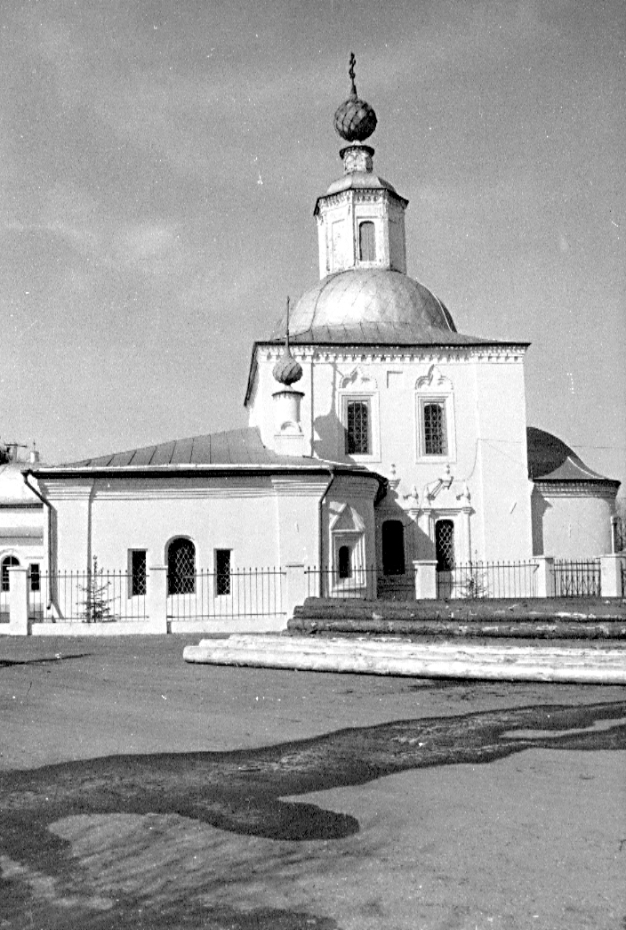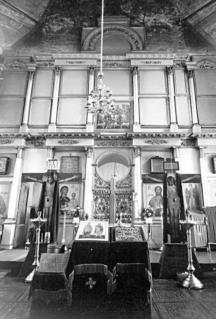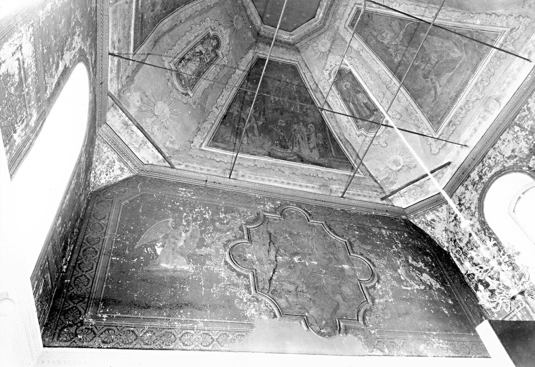 | | Церковь Козьмы и Дамиана,сер. XVIII в., 1-я треть XIX в.Адрес Церковь, стоящая на высоком холме над железной дорогой, видна со многих улиц западной части города и играет большую роль в формировании его панорамы. Вокруг храма расположено старое, заросшее деревьями кладбище. Компактный кубовидный двусветный четверик храма завершен высокой кровлей гуськового очертания и увенчан миниатюрной чешуйчатой главкой, поднятой над шлемовидной кровлей восьмигранного барабана. Пониженная полуциркульная апсида и широкая трапезная, придельные алтари которой частично прикрывают основной объем, равны по высоте. С запада устроен небольшой притвор с купольной кровлей. Храм окружен профилированным цоколем. Углы четверика подчеркнуты широкими огибающими лопатками, а венчает его профилированный карниз с поясом мелких двухступенчатых консолек. Окна боковых фасадов, размещенные по двум осям, оформлены вдавленными ступенчатыми рамками, которые в верхнем ярусе завершены килевидными кокошниками, а в нижнем — дополнены колончатыми наличниками с разорванными фронтонами в духе нарышкинского барокко. Стены апсиды и трапезной венчают простые ступенчатые карнизы. Окна придельных алтарей в профилированных рамках с треугольными фронтончиками, по-видимому, относятся к первоначальному периоду строительства, а тройные итальянские окна на боковых фасадах — результат перестроек XIX в. Аналогичные тройные окна украшают также боковые фасады западного притвора. Храмовый четверик перекрыт восьмилотковым сводом с восьмигранным отверстием светового барабана в шелыге. Узкие диагональные грани опираются на плоские тромпы. Три арки ведут в алтарь, конха которого прорезана тремя распалубками над окнами. Трапезная перекрыта поперечным лотковым сводом с распалубками над окнами; в притворе — плоский потолок. Внутри в основании свода и под окнами второго света проходят профилированные карнизы с сухариками. Верхний ярус стен и свод четверика украшены живописью. В своде она относится к 1-й пол. XIX в. и интересна как пример живучести барочных традиций в росписях провинции. На основных гранях в поздних тянутых обрамлениях помещены многофигурные композиции на библейские темы, на диагональных — святые в рост, под ними в сияниях — символы веры. Общий колорит росписей теплый, высветленный, построенный на сочетании бледно-зеленого фона стен, охристых тонов в рокайльных орнаментах и оливково-зеленоватых в сюжетных композициях. Плохо сохранившаяся живопись на боковых стенах (евангелисты) сильно прописана маслом, а роспись западной стены с сюжетной сценой в профилированном тянутом квадрифолии и фигурами ангелов по сторонам появилась в нач. XX в. Главный иконостас, голубой, с позолоченными деталями и колоннами, выкрашенными «под мрамор», перевезен из церкви Рождества Богоматери в с. Реброво Галичского района. Он выполнен в 1820-1830-е гг. в стиле классицизма. Два яруса стройных колонн с коринфскими капителями несут неполные антаблементы с гладким фризом и профилированным карнизом, декорированным мутулами и резными розетками. Раскреповки антаблементов образуют подобия двухколонных портиков. Царские врата украшены гирляндами из виноградных гроздьев. В храме сохранилось покрытие из чугунных плит с изображением букетов в круглой рамке. Лит. и ист.: Ратшин А. Полное собра
