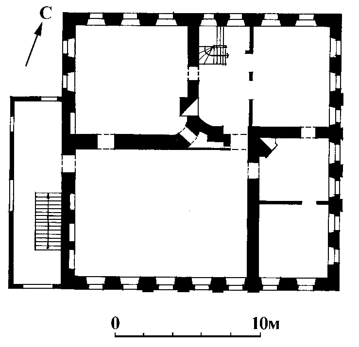 | | Управа земская,1-я четв. XIX в.Адрес Квадратный в плане объем с семью осями окон на основных фасадах завершен вальмовой кровлей. С западной стороны примыкает поздняя пристройка входа. Композиция уличных фасадов идентична. Ленте профилированного цоколя вторит широкий гладкий пояс под окнами второго этажа, который перерезают четыре пилястры большого ордера с коринфскими капителями. Они зрительно поддерживают слабо раскрепованный неполный антаблемент с гладким фризом и профилированным карнизом с деревянной выносной плитой, украшенной чередующимися мутулами и розетками. На южном фасаде над центром сохранился треугольный фронтон. В средней части дворового южного фасада находится крыльцо первоначального парадного входа, акцентированное металлическим зонтом на ажурных кронштейнах. Планировка дома частично изменена, но отчетливо читается система связи комнат, расположенных по периметру здания круговым обходом. В юго-западной части второго этажа расположен крупный зал. Две комнаты-гостиные за ним, выходящие окнами на северный фасад, имели один скругленный угол. Лит. и ист.: Белов Л. Улица Свободы // Ленинский путь. Галич, 1979. 15 мая; Памятники архитектуры Костромской области. Вып. 3. Кострома, 2001. С. 153; Балакин Ю. Улица Свободы // Галичские известия. Галич, 2001. 23 августа. Данные государственной охраны Категория охраны: объект культурного наследия федерального значения Название по постановлению: Здание земской управы Датировка по постановлению: 1-я пол.XIXв. Постановление: Указ Президента РФ от 20.02.1995 г. № 176 «Об утверждении Перечня объектов исторического и культурного наследия федерального (общероссийского) значения» |