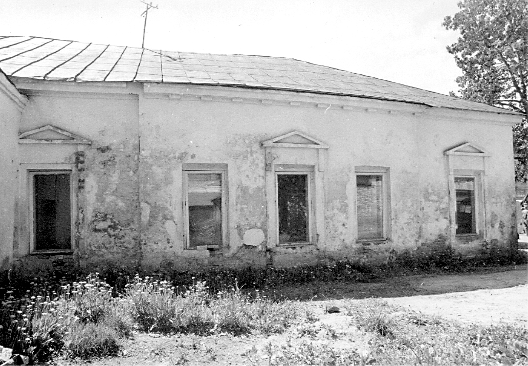 | | Духовное правление,1-я треть XIX в.Адрес Одноэтажное кирпичное оштукатуренное здание расположено в глубине квартала и главным северным фасадом обращено к соборному комплексу. Компактный, прямоугольный в плане объем, вытянутый по оси запад-восток, завершен вальмовой кровлей. С востока к нему примыкает протяженный хозяйственный корпус советского времени. Главный фасад, центр которого подчеркнут слабым ризалитом, прорезан пятью прямоугольными окнами, по нечетным осям отмеченными пологими треугольными сандриками на вытянутых кронштейнах (штукатурные пилястры и подоконные украшения в виде балясника, показанные на проекте, не сохранились). Профилированный венчающий карниз на ризалите дополнен редкими мутулами. Такие же мутулы украшали склоны фронтона. Внутренняя планировка здания с периметральным размещением комнат (по главному фасаду — связанные анфиладой присутствие, канцелярия и архив, а по дворовому, по сторонам сеней, — арестантский покой и чулан) ныне искажена. Лит. и ист.: Памятники архитектуры Костромской области. Вып. 3. Кострома, 2001. С. 152. РГИА. Ф. 1488. Оп. 2. Ед. хр. 282. Персоны Висконти 2-й Д. Данные государственной охраны Категория охраны: объект, предлагаемый к включению в список выявленных объектов культурного наследия |