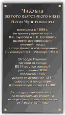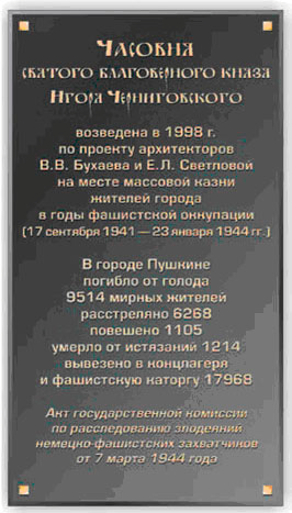 | | | | hidden The chapel of Saint igor of Chernigov | | Memorial plate at the Chapel of Saint Igor of Chernigov.A memorial plate in commemoration of sufferings of Pushkin citizens during the fascist occupation of the town was opened at the Chapel of Saint Igor of Chernigov in the year of the 300th ... | | Memorial plate at the Chapel of Saint Igor of Chernigov. A memorial plate in commemoration of sufferings of Pushkin citizens during the fascist occupation of the town was opened at the Chapel of Saint Igor of Chernigov in the year of the 300th anniversary of Tsarskoye Selo. Was built in 1998 according to the designs of architects VV. Bukhaev and E.L. Svetlova at the place of mass execution of Pushkin citizens during the fascist occupation of the town (September 17, 1941 – January 23, 1944). 9,514 residents of Pushkin died of cold, 6,268 were shot, 1,105 were hung, 1,214 died of torture, 17,968 were sent to concentration camps. Nazi atrocities report dated March 07, 1944