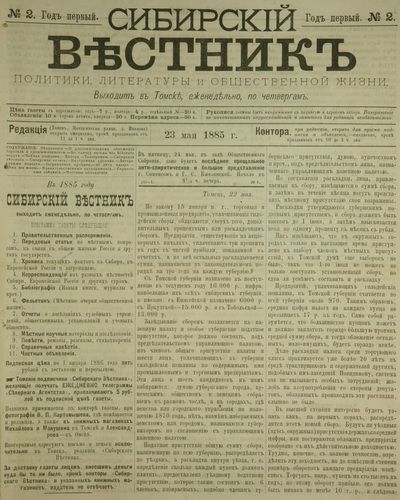 Вышел первый номер новой газеты «Сибирский вестник политики, литературы и общественной жизни» (последний номер газеты вышел 30 декабря 1905 г.). Основателем газеты и ее первым редактором был В.П. Картамышев.