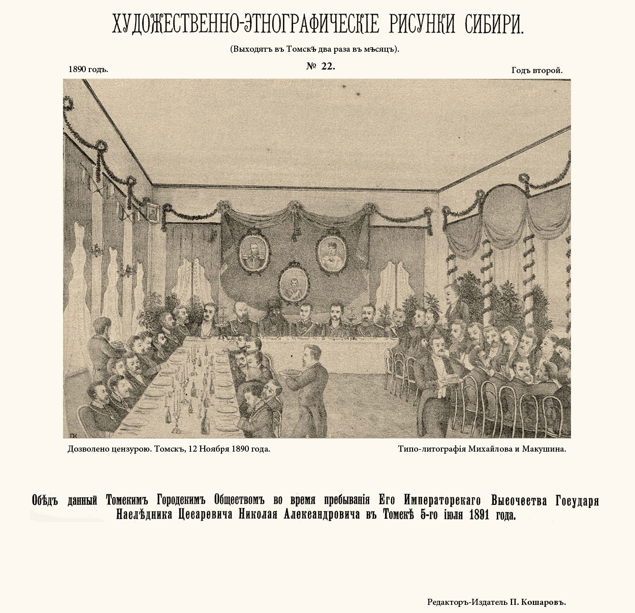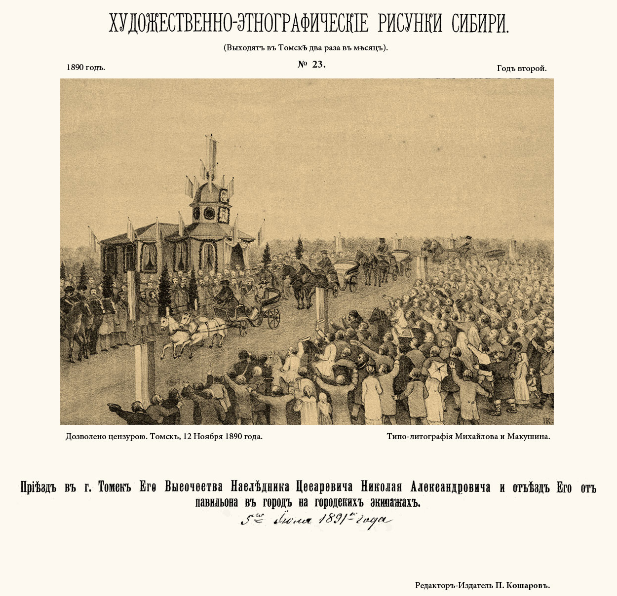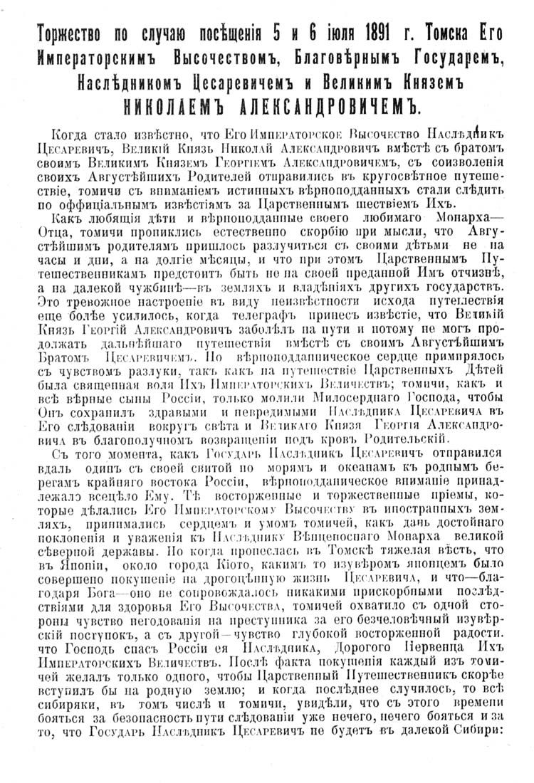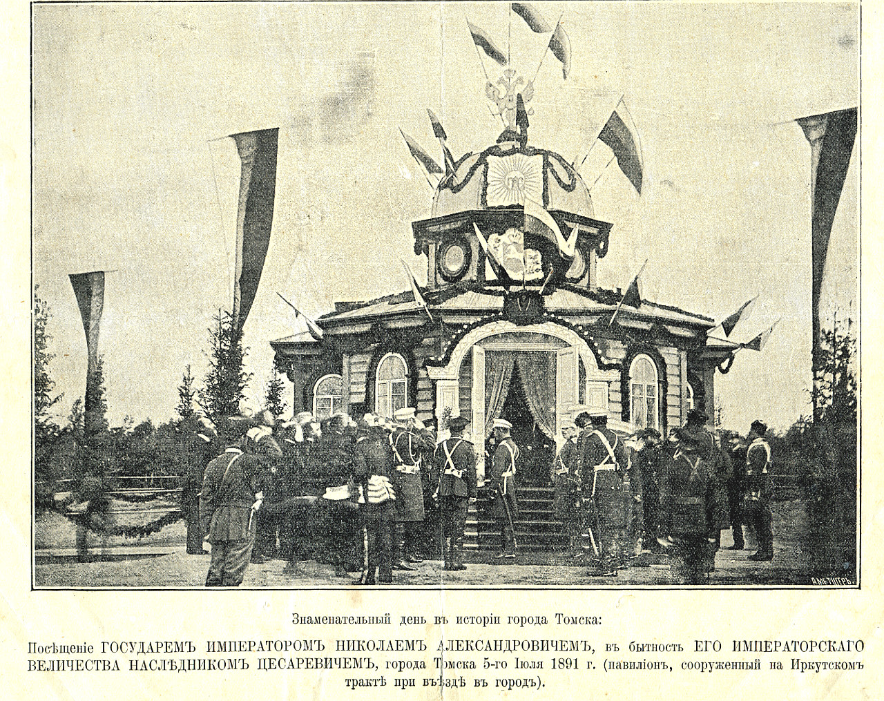 СобытиеПребывание в Томске цесаревича Николая Александровича (будущего российского императора Николая II). Августейшего гостя встречали у специально построенного павильона на Иркутском тракте в 4-х верстах от Томска. Перед основной массой народа наследник престола предстал на Базарной площади, где он посетил Иверскую часовню. После традиционного молебна, поднесения иконы и целования креста процессия направилась к только что построенному губернаторскому дому (ныне Дом ученых по улице Советской). Будущий государь получил из рук П.В. Михайлова подарочный альбом с видами Томска и осчастливил рукопожатием некоторых представителей власти и купечества. В этот же день он посетил преосвященного Макария и Иоанно-Предтеченский женский монастырь, побывал он также в келье Федора Кузьмича и на его могиле. Вечером в его честь был дан торжественный ужин в Общественном собрании. Утром следующего дня цесаревич посетил Томский университет. В актовом зале Николаю Романову вручили диплом Почетного члена университета и попросили его принять первый сибирский университет под свое покровительство. Не обошел своим вниманием Николай Александрович библиотеку и музеи Университета. Отбыл из Томска будущий император с Черемошинской пристани на пароходе «Николай».