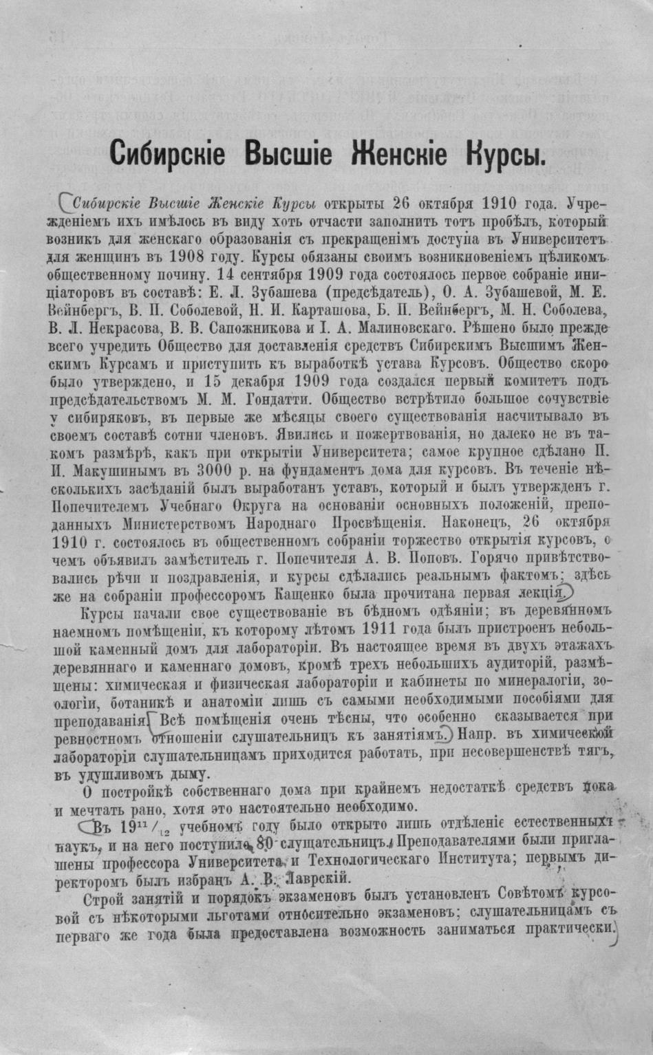 СобытиеТоржественное открытие Сибирских высших женских курсов в Томске, первого в Сибири женского вуза, 3-го вуза в Томске. Действовали в составе естественного и математического отделений физико-математического факультета до 2 июня 1920 года, когда решением Сибревкома были закрыты.