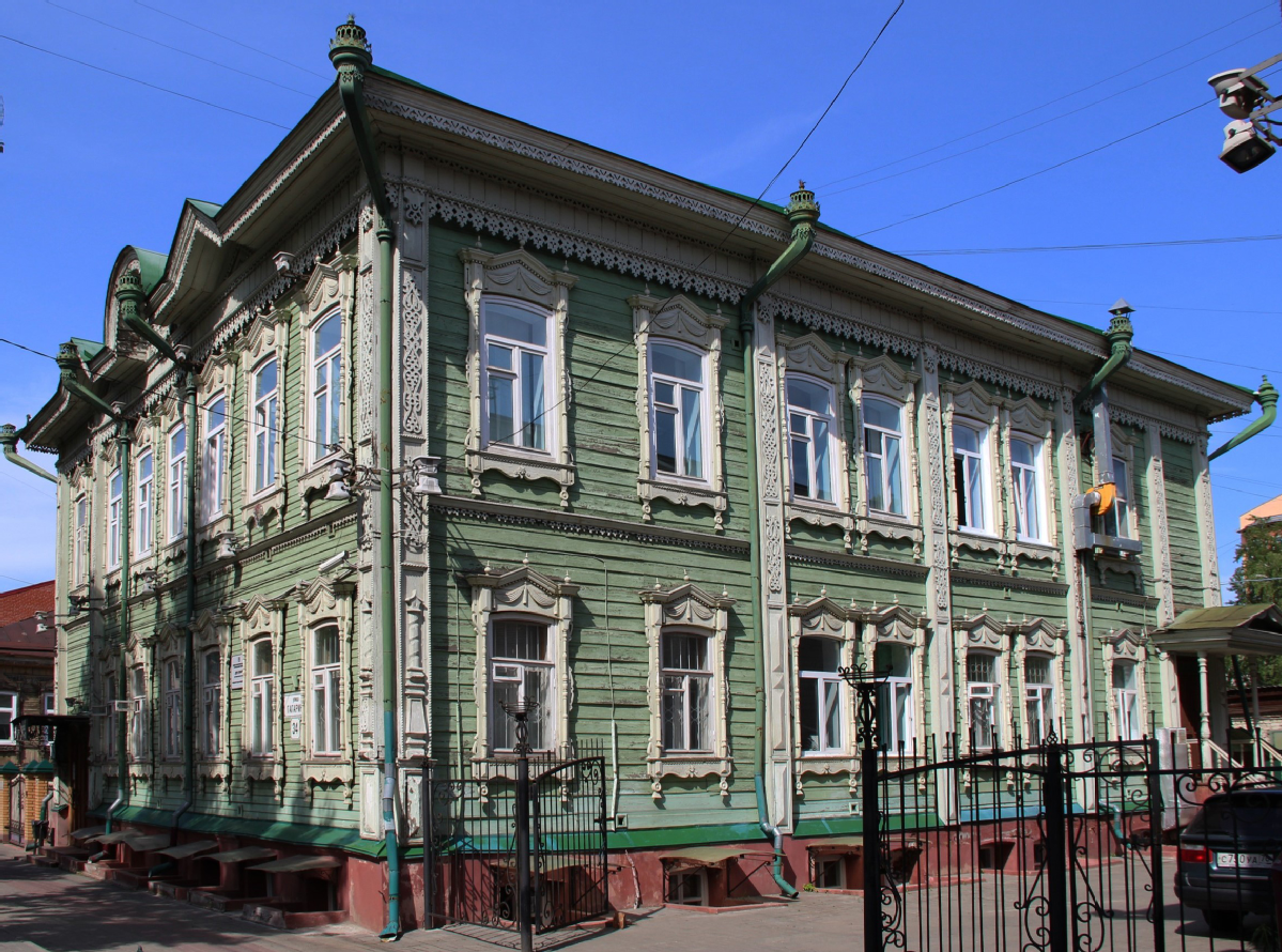 Здание расположено в центральной части города, по красной линии улицы, в окружении двухэтажных деревянных домов дореволюционной постройки. Объем деревянный, на каменном цоколе, рублен в два этажа, обшит. Симметрия главного фасада частично нарушена решением уличного входа (с северной стороны фасада). Центральная ось подчеркнута круглым фронтоном, две вспомогательных – треугольными фронтонами по карнизу. Углы дома обшиты и декоративно оформлены резными деталями. На первом этаже расположена колонка, на втором этаже – декор растительного орнамента. Карниз и фриз дома декорированы. Центральный фронтон в тимпане украшен резным солярным знаком. Наличники – с треугольным завершением, колонками по боковинам и широким нижним полем изогнутого очертания. Дворовые фасады решены в аналогичной декоративной манере. Планировка квартир определяется входными частями (дворовый и уличный вход). Частично сохранилась отделка интерьеров: стены в некоторых комнатах имеют профилированные потолочные карнизы, потолки – лепные розетки. Основные габариты в плане: 18,5 х 16,8 м.