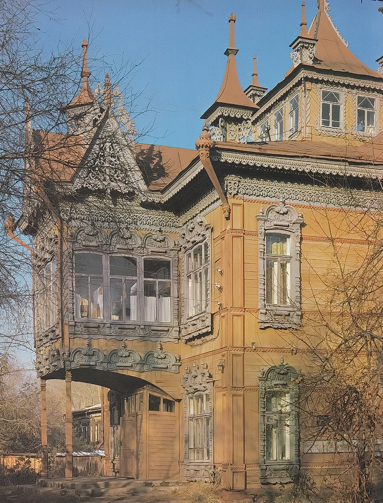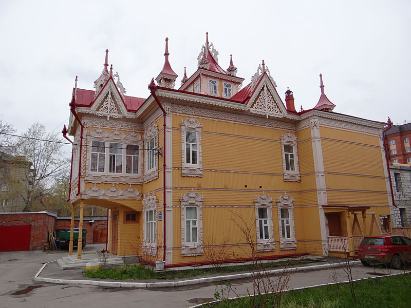 В 1903 г. этим архитектором был построен дом-флигель, расположенный во дворе основного дома № 67 и являющийся наиболее интересным, подлинно художественным памятником. По красоте и сложности резьбы, оригинальности декора, выразительности форм он достоин первого места среди памятников деревянной архитектуры Томска конца XIX - начала XX в.