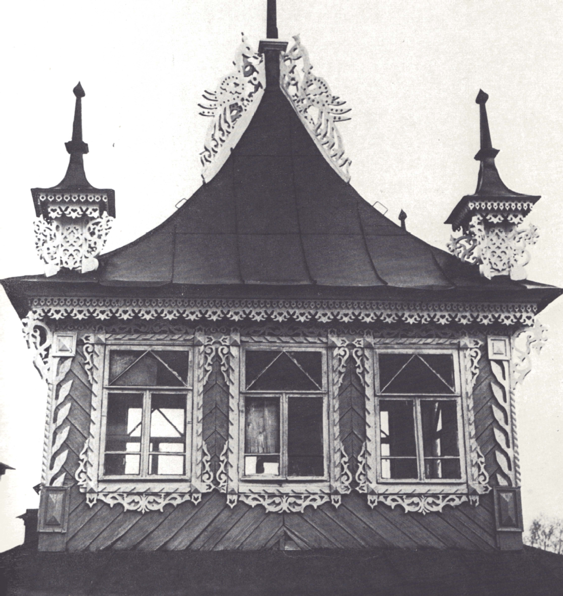 Почти квадратное в плане, небольшое по размерам, деревянное здание устремляется ввысь прекрасно прорисованным силуэтом башенок и их завершений. Простой контур здания обогащают пристроенные с двух сторон веранды, завершающиеся острыми треугольниками небольших фронтонов. Стены веранд прорезаны большими строенными окнами, украшенными рельефными обрамлениями, что делает их лёгкими и прозрачными. Спокойная гладь стены основного объёма со своей ритмической обшивкой и редко поставленными окнами, обрамлёнными изысканными резными наличниками, прекрасно контрастирует с лёгкими верандами. Здание предстает как постамент для центральной башни, увенчанной плавно изогнутым высоким шатром красивого рисунка. Прорезные решётки во фронтонах со сложным узором растительного орнамента добавляют сказочности зданию. Особенно хороши завершения фронтонов акротериями: стилизованные жар-птицы как бы прилетели из русских народных сказок, и резные волюты угловых башенок, изогнутые линии их шатров придают рисунку кровли особую свежесть и остроту. Национальные русские формы деревянной архитектуры и резьбы сочетаются здесь с элементами барокко, своеобразно трактованным в дереве – по своей форме валютообразные завершения наличников напоминают элементы барочного декора. Совершенное богатство отдельных элементов наряду с лаконизмом целого – свидетельство большой художественной зрелости и таланта, проявленных и в замысле, и в исполнении.