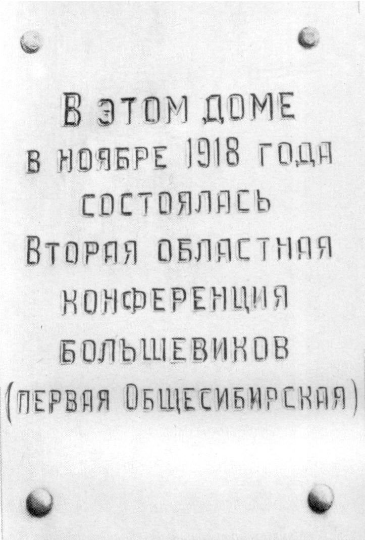 14 декабря 1969 г. на здании была установлена мраморная мемориальная доска с текстом: «В этом доме в ноябре 1918 г. состоялась областная конференция большевиков (первая общесибирская)». В настоящее время она заменена охранной доской без исторической информации о событии.
