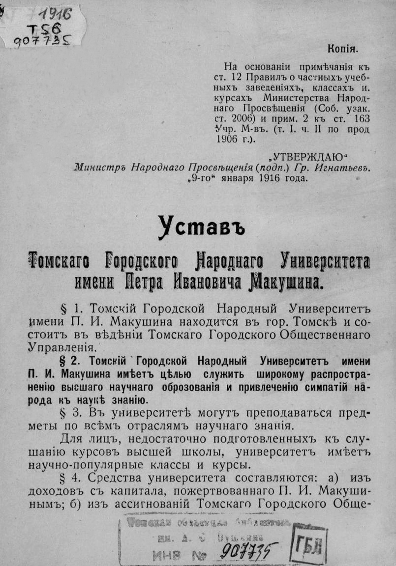 В январе 1916 г. министр просвещения Павел Николаевич Игнатьев, наконец, утвердил устав народного университета. Началась подготовка к его открытию. 30 декабря 1917 г. состоялись выборы хозяйственного комитета и организационное собрание попечительского совета. 16 января 1918 г. в аудитории Томского университета для слушателей Народного университета профессор А.А. Гвоздев прочитал первую лекцию о творчестве У. Шекспира. Здесь же в 1918–1919 гг. читались отдельные лекционные курсы. 13 октября 1925 г. Народный университет был вновь открыт на торжественном заседании в актовом зале Томского университета в присутствии П.И. Макушина, но вскоре закрылся, фактически не начав своей работы.
