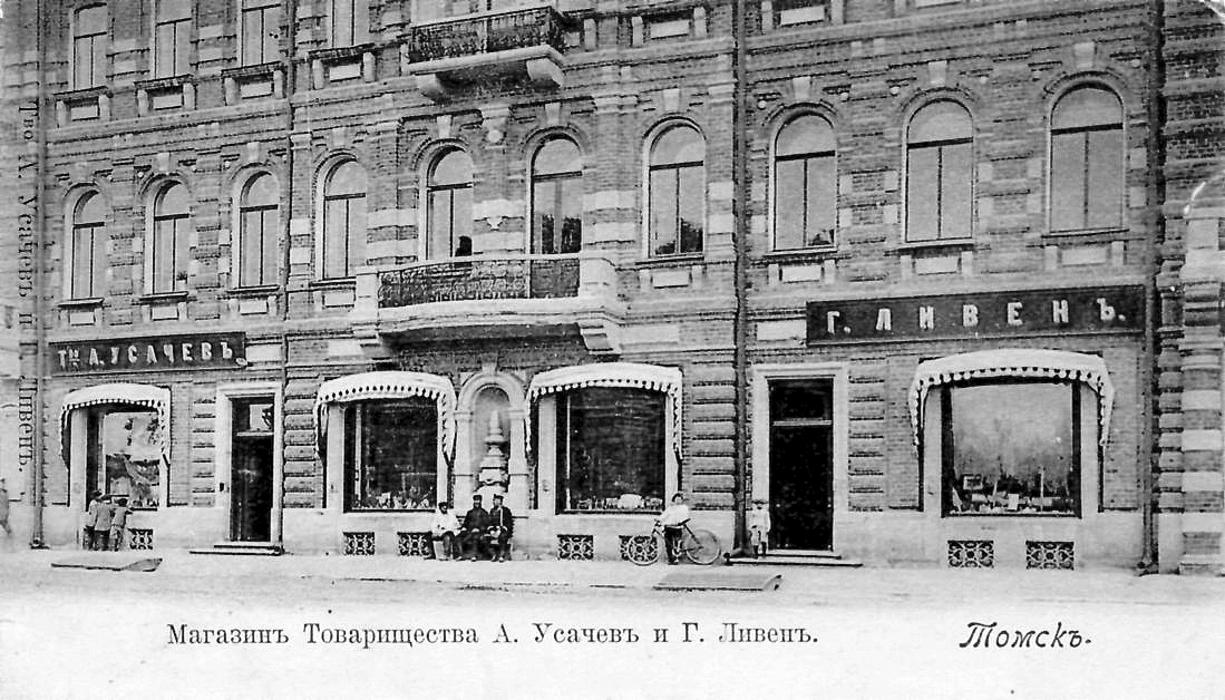 Осенью 1900 г. первый этаж здания был сдан в аренду товариществу «А. Усачев и Г. Ливен» под магазин учебных пособий, канцелярских товаров, фотографических принадлежностей, материалов для переплетного дела. В 1908 г. небольшое помещение под магазин арендовало общество потребителей служащих Сибирской железной дороги. У них был отдельный вход с угла здания (сейчас заложен). В 1915 г. Петр Иванович Макушин открыл здесь свой второй книжный магазин (первый находился в пер. Батенькова, 5). Второй и третий этажи здания торгового дома в дореволюционный период арендовали два главных финансовых учреждения Томской губернии – Казенная палата (выполняла функции фискальные, распорядительные, отчетные и контрольные, ведала государственными доходами и расходами в губернии) и Губернское казначейство (вело кассовое обслуживание государственных учреждений, принимало от налогоплательщиков налоги). Обе финансовые организации были ликвидированы в первые годы советской власти, в начале 1920 г.