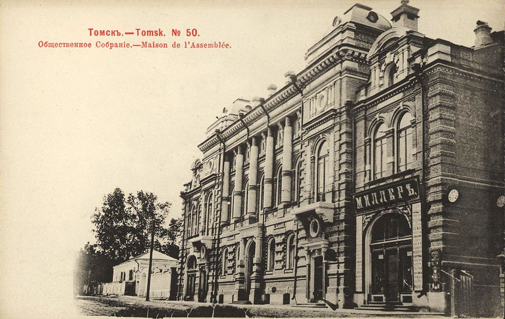 Общественное собрание города Томска возглавлял Совет старшин (9-10 человек), избираемых из числа наиболее авторитетных членов клуба. Основную массу посетителей составляли его действительные члены (300-400 человек) – купцы, чиновники, интеллигенция. В концертном зале проводились спектакли, маскарады, концерты, балы, новогодние представления и благотворительные вечера, читались лекции (часто сдавался в аренду). При Общественном собрании существовал оркестр, которым с 1900 г. руководил капельмейстер Моисей Исаевич Маломет, а с 1902 г. – Яков Соломонович Медлин (директор томских музыкальных классов), работала одна из самых больших библиотек города. После погрома в октябре 1905 г., когда в Томске черносотенцами был сожжён находившийся на Ново-Соборной площади театр Королёва, Общественное собрание стало центром культурной жизни города. На сцене зрительного зала собрания регулярно выступали местные и приезжие театральные труппы, регулярно устраивались концерты. Так, 8 (21) мая 1909 г. в Общественном собрании выступала приехавшая на гастроли выдающаяся русская актриса Вера Федоровна Комиссаржевская.