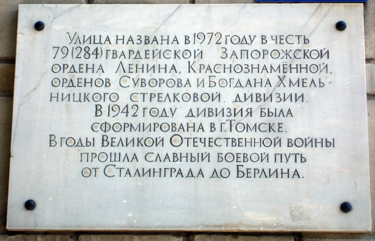 Краткий текст«Улица названа в 1972 году в честь 79 (284) гвардейской Запорожской ордена Ленина, Краснознамённой, орденов Суворова и Богдана Хмельницкого стрелковой дивизии. В 1942 году дивизия была сформирована в Томске. В годы Великой Отечественной войны прошла