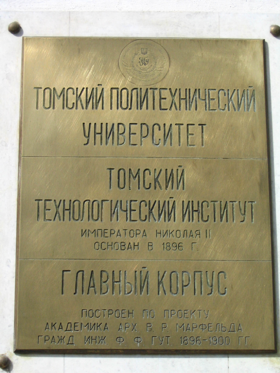 «Томский политехнический университет. Томский технологический институт Императора Николая II. Основан в 1896 г. Главный корпус. Построен по проекту академика арх. Р.Р. Марфельда гражд. инж. Ф.Ф. Гут 1896-1900 гг.»