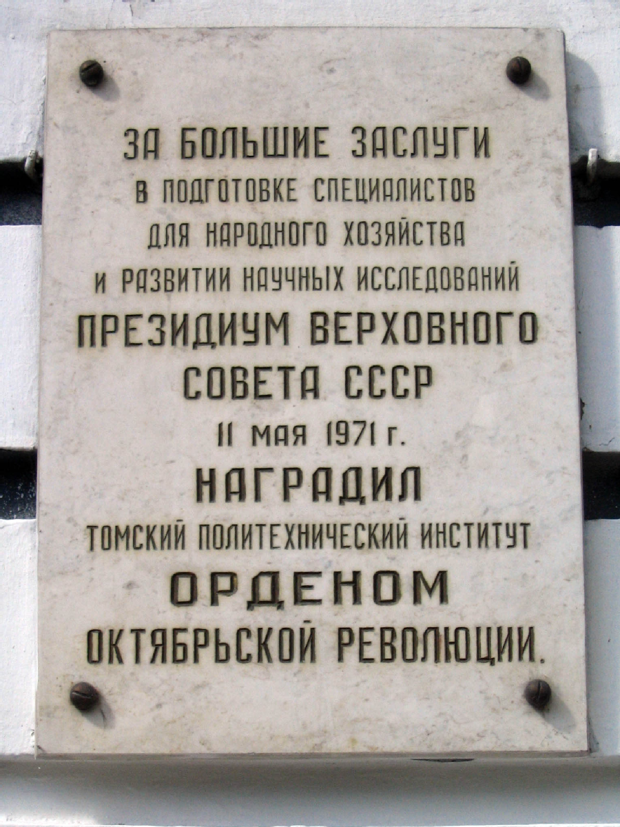 Открыта: не ранее 1971. Мрамор.«За большие заслуги в подготовке специалистов для народного хозяйства и развитии научных исследований Президиум Верховного Совета СССР 11 мая 1971 г. наградил Томский политехнический институт орденом Октябрьской Революции»