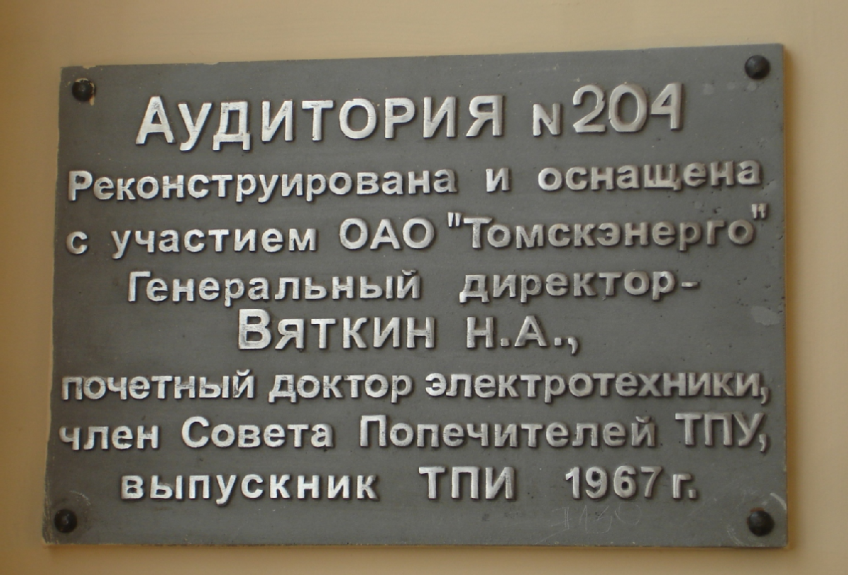 Краткий текст«Аудитория № 204. Реконструирована и оснащена с участием ОАО «Томскэнерго». Генеральный директор – Вяткин Н.А., почётный доктор электротехники, член Совета Попечителей ТПУ, выпускник ТПИ 1967 г.» Металл.