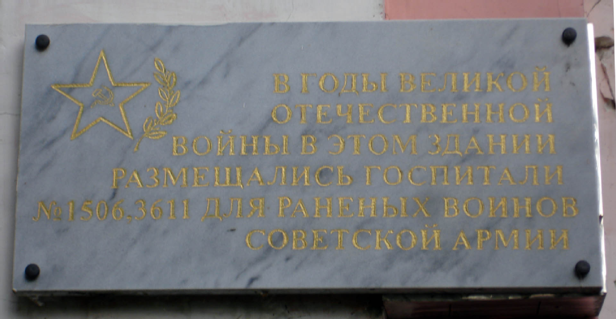 «В годы Великой Отечественной войны в этом здании размещались госпитали № 1506, 3611 для раненых воинов Советской Армии».