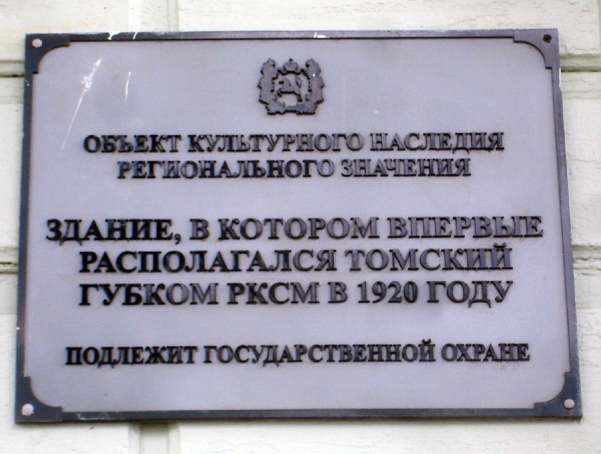 Краткий текст«Объект культурного наследия регионального значения. Здание, в котором впервые располагался Томский Губком РКСМ в 1920 году. Подлежит государственной охране»