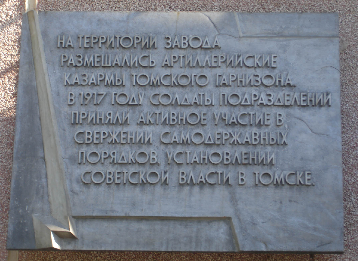 Открыта: ноябрь 1987. Металл, барельеф. Краткий текст«На территории завода размещались артиллерийские казармы Томского гарнизона. В 1917 году солдаты подразделений приняли активное участие в свержении самодержавных порядков, установлении Советской власти в Томске»