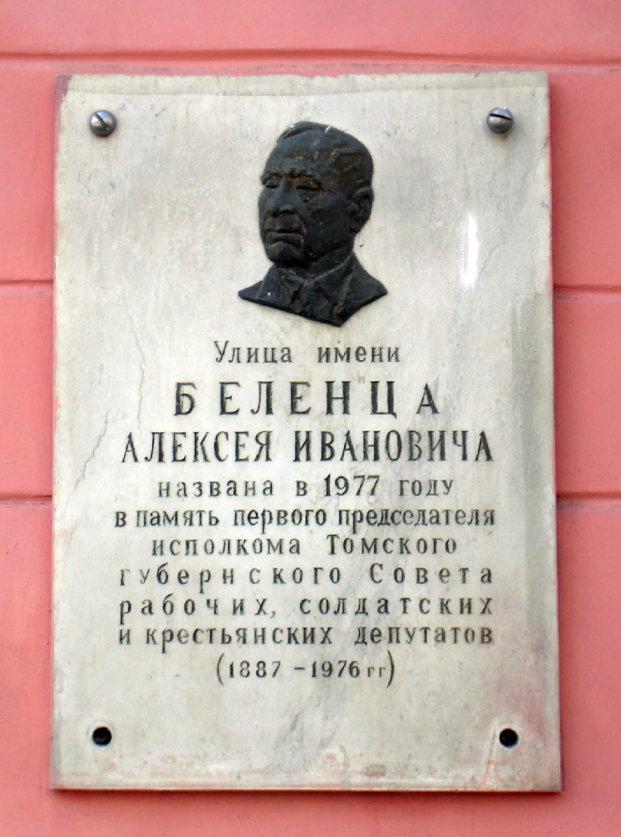 «Улица имени Беленца Алексея Ивановича названа в 1977 году в память первого председателя исполкома Томского губернского Совета рабочих, солдатских и крестьянских депутатов (1887-1976 гг.)»
