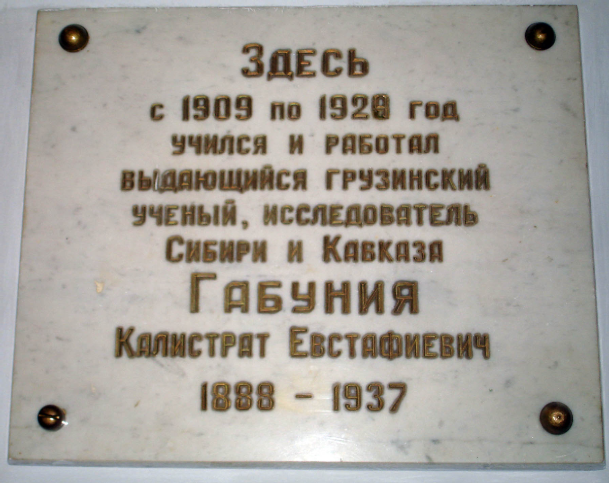 Открыта:15 июня 1972. Мрамор. Краткий текст«Здесь с 1909 по 1928 год учился и работал выдающийся грузинский ученый, исследователь Сибири и Кавказа Габуния Калистрат Евстафиевич. 1888-1937»