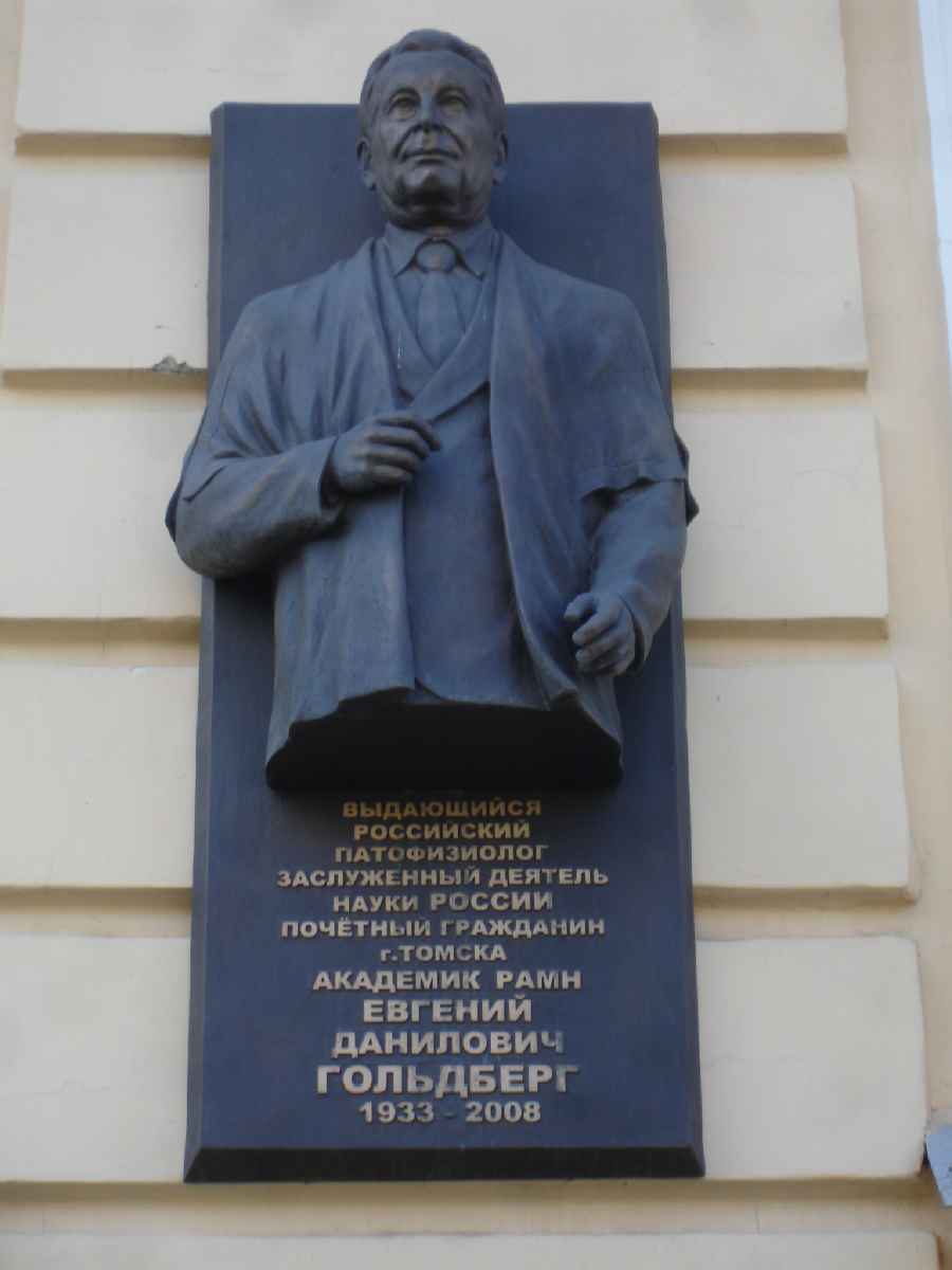 Автор: скульптор Н.П. Гнедых. Бронза, горельеф.«Выдающийся российский патофизиолог. Заслуженный деятель науки России. Почётный гражданин г. Томска. Академик РАМН Евгений Данилович Гольдберг. 1933-2008»