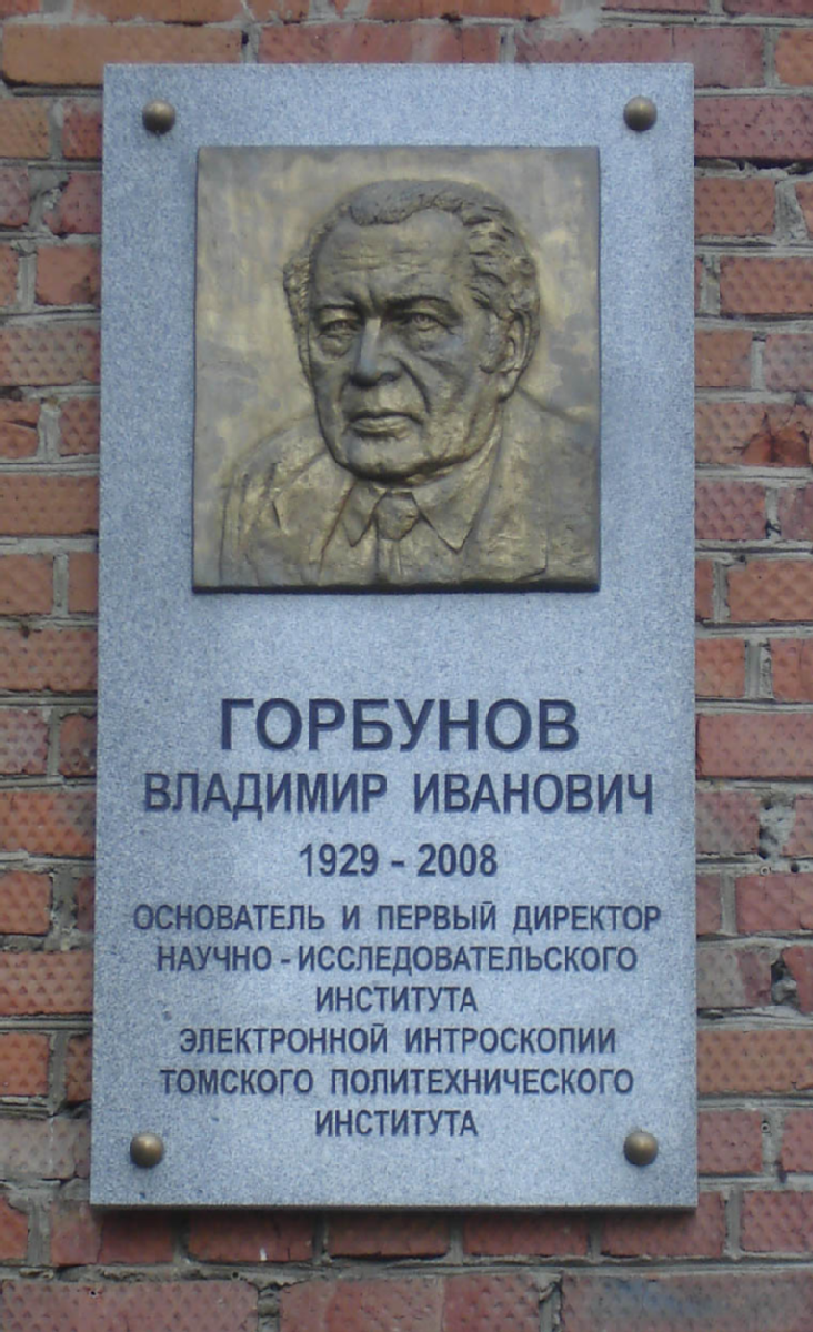 Открыта: 2009. Бронза, гранит, барельеф (портрет).«Горбунов Владимир Иванович. 1929-2008. Основатель и первый директор научно-исследовательского института электронной интроскопии Томского политехнического института»