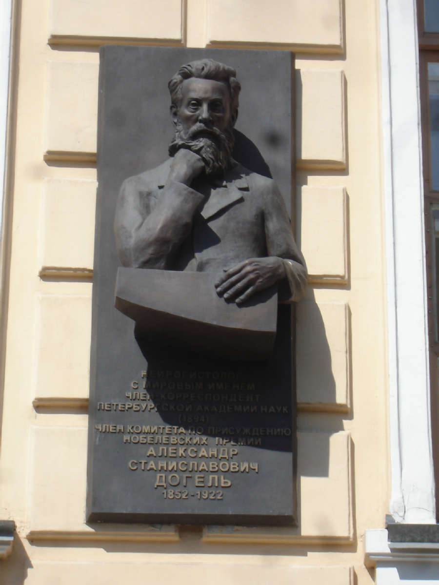 Автор: скульптор Н.П. Гнедых, изготовитель – компания «Лит Арт» (г. Жуковский Московской области). Бронза, горельеф.«Нейрогистолог с мировым именем, член-корреспондент Петербургской академии наук (1894). Член комитета по присуждению Нобелевских премий Александр Станиславович Догель. 1852-1922»