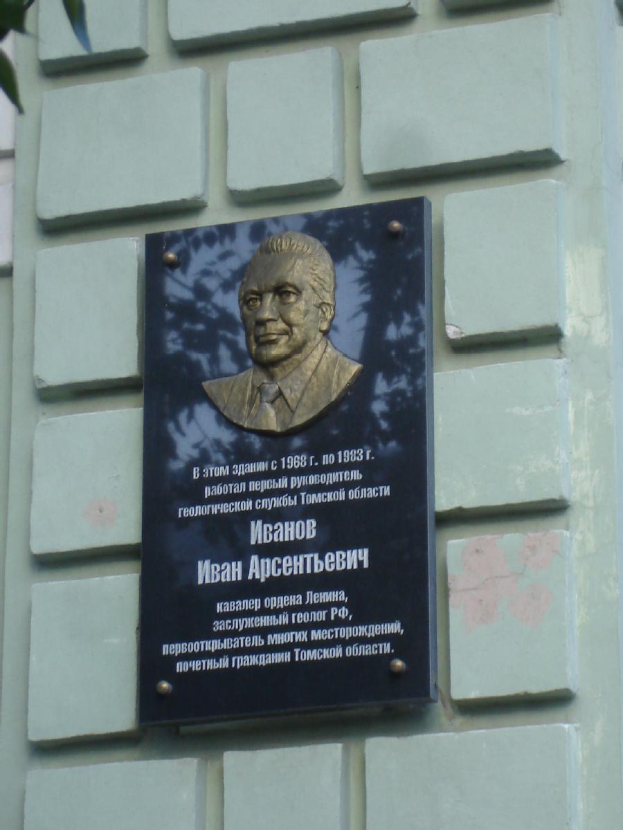 Открыта:18 апреля 2014. Гранит, бронза, барельеф (портрет).«В этом здании с 1968 г. по 1983 г. работал первый руководитель геологической службы Томской области Иванов Иван Арсентьевич. Кавалер ордена Ленина, заслуженный геолог РФ, первооткрыватель многих месторождений, почётный гражданин Томской области»
