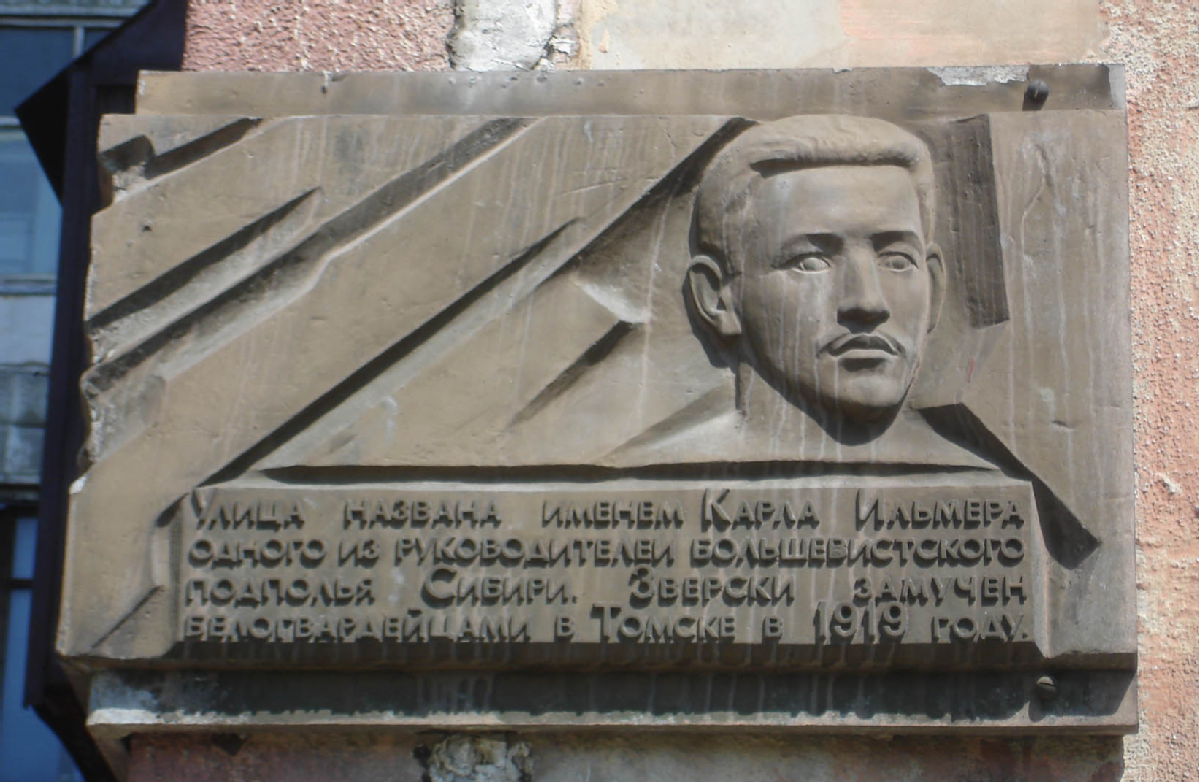 Открыта: ноябрь 1987. Металл, барельеф (портрет).«Улица названа именем Карла Ильмера, одного из руководителей большевистского подполья Сибири. Зверски замучен белогвардейцами в Томске в 1919 году»