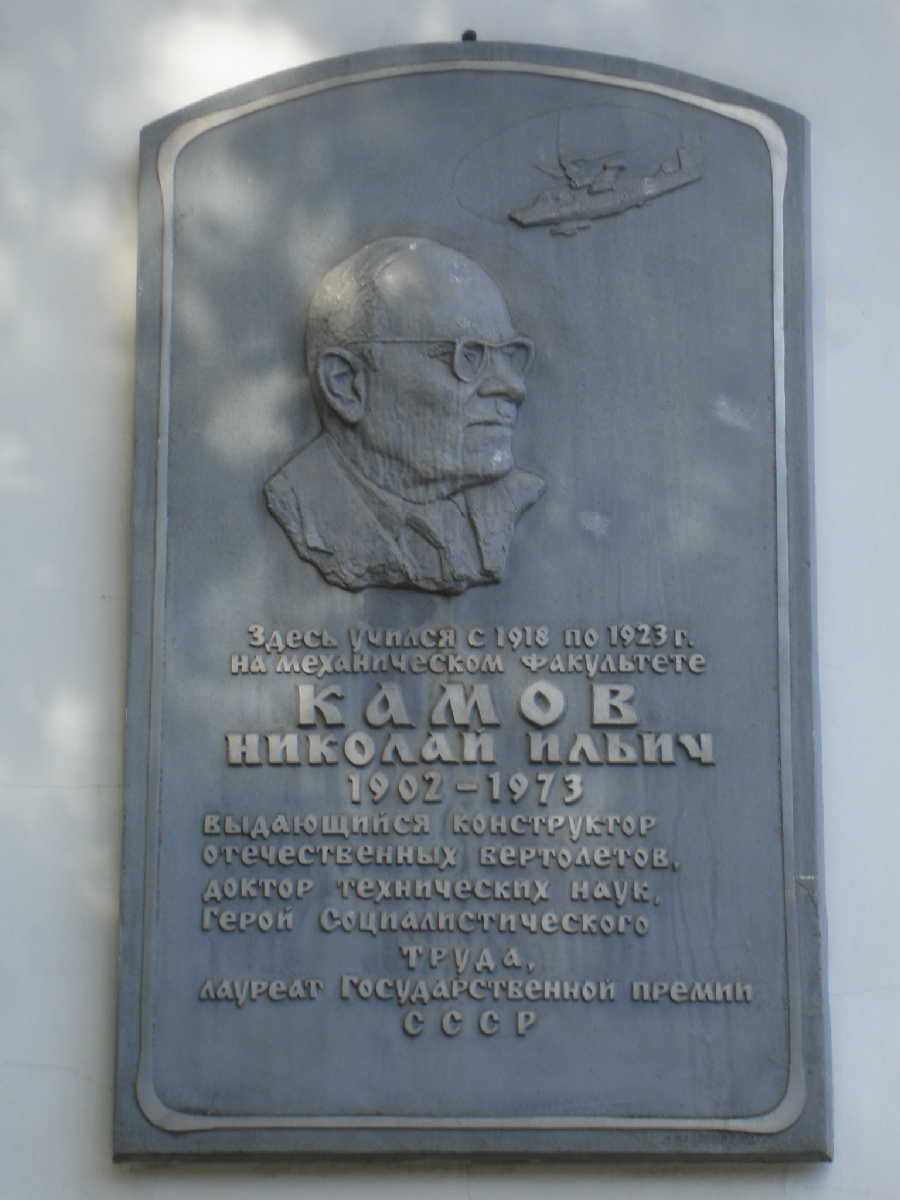 «Здесь учился с 1918 по 1923 г. на механическом факультете Камов Николай Ильич 1902-1973, выдающийся конструктор отечественных вертолетов, доктор технических наук, Герой Социалистического Труда, лауреат Государственной премии СССР»
