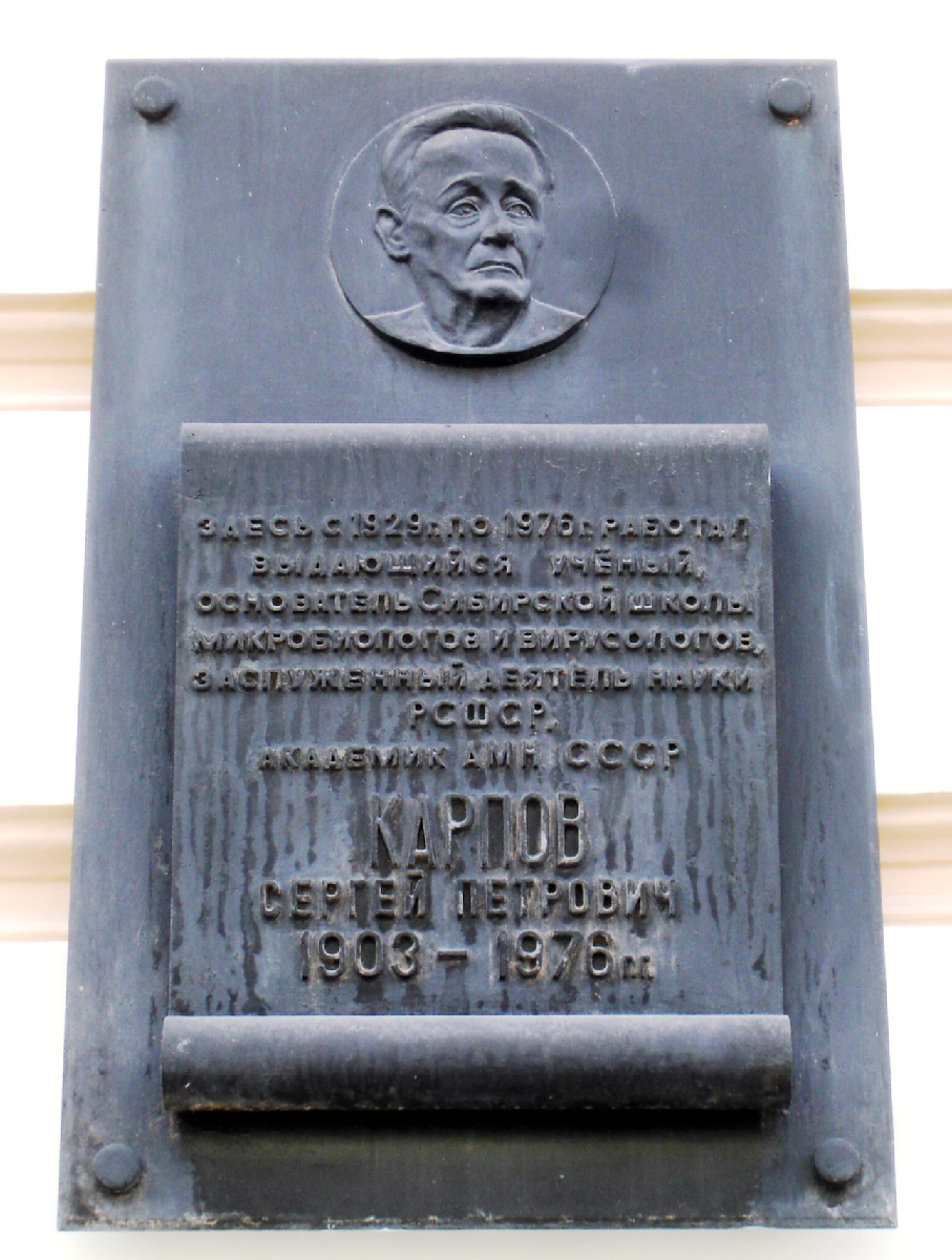 «Здесь с 1929 г. по 1976 г. работал выдающийся учёный, основатель Сибирской школы микробиологов и вирусологов, заслуженный деятель науки РСФСР, академик АМН СССР Карпов Сергей Петрович. 1903-1976 гг.»