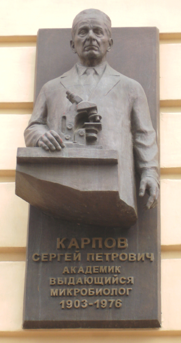 Автор: скульптор А.Н. Гнедых. Бронза, горельеф.«Карпов Сергей Петрович. Академик. Выдающийся микробиолог. 1903-1976»