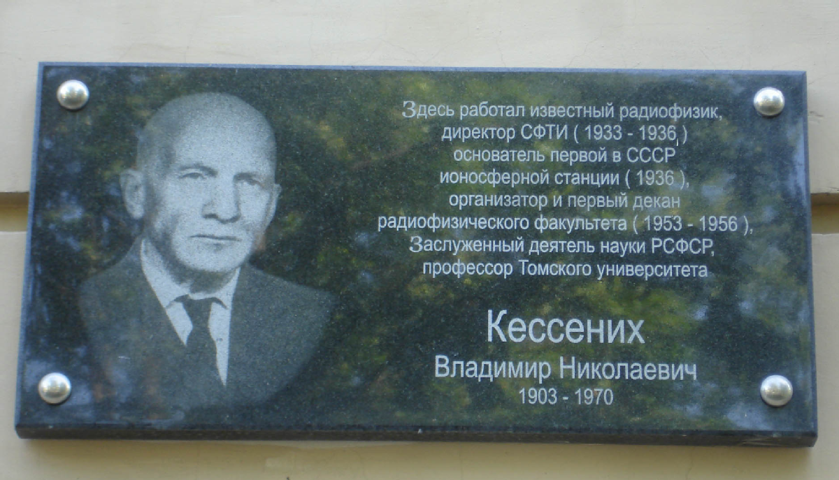 «Здесь работал известный радиофизик, директор СФТИ (1933-1936), основатель первой в СССР ионосферной станции (1936), организатор и первый декан радиофизического факультета (1953-1956), Заслуженный деятель науки РСФСР, профессор Томского университета Кессених Владимир Николаевич. 1903-1970»