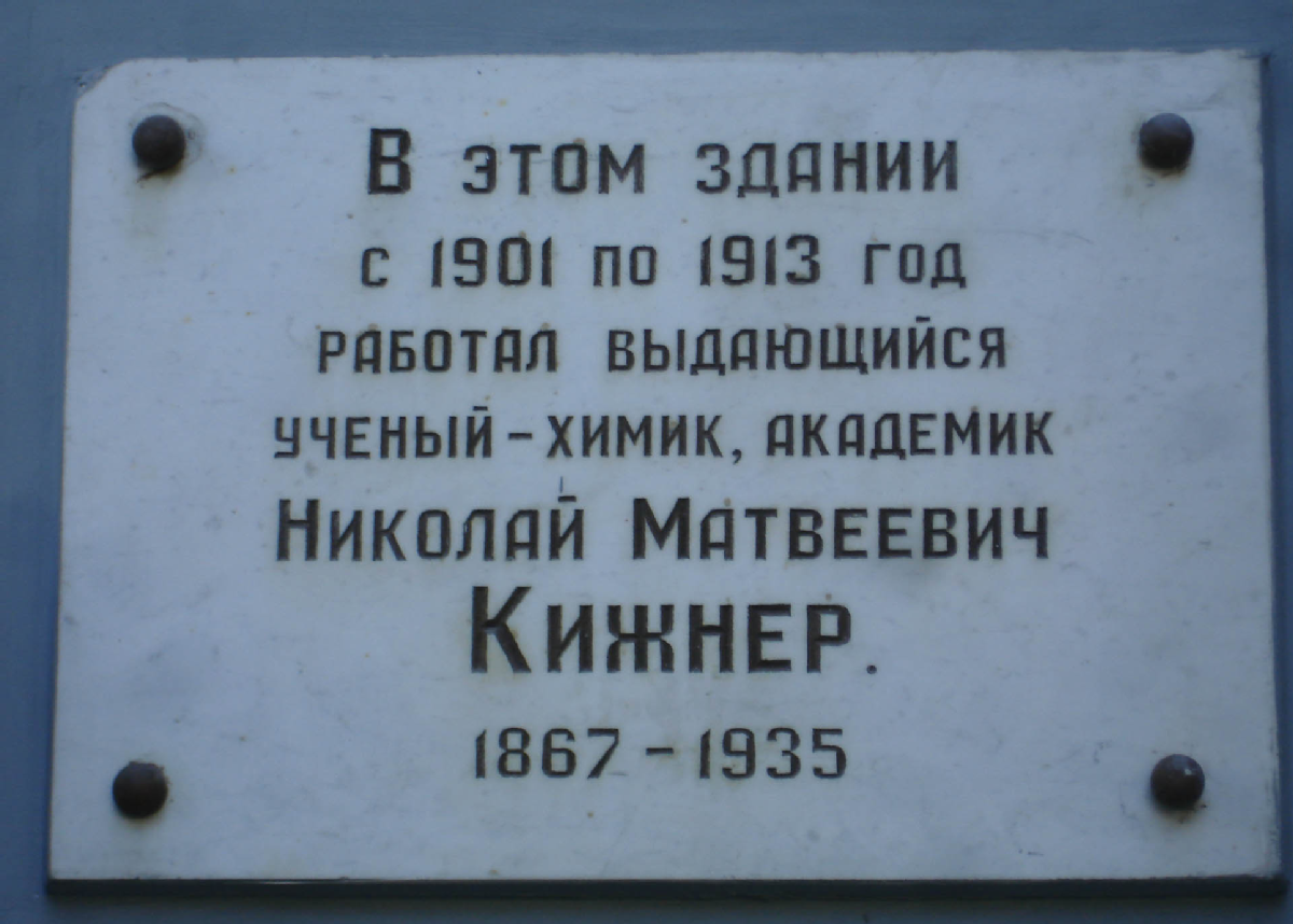 «В этом здании с 1901 по 1913 год работал выдающийся ученый-химик, академик Николай Матвеевич Кижнер. 1867-1935»
