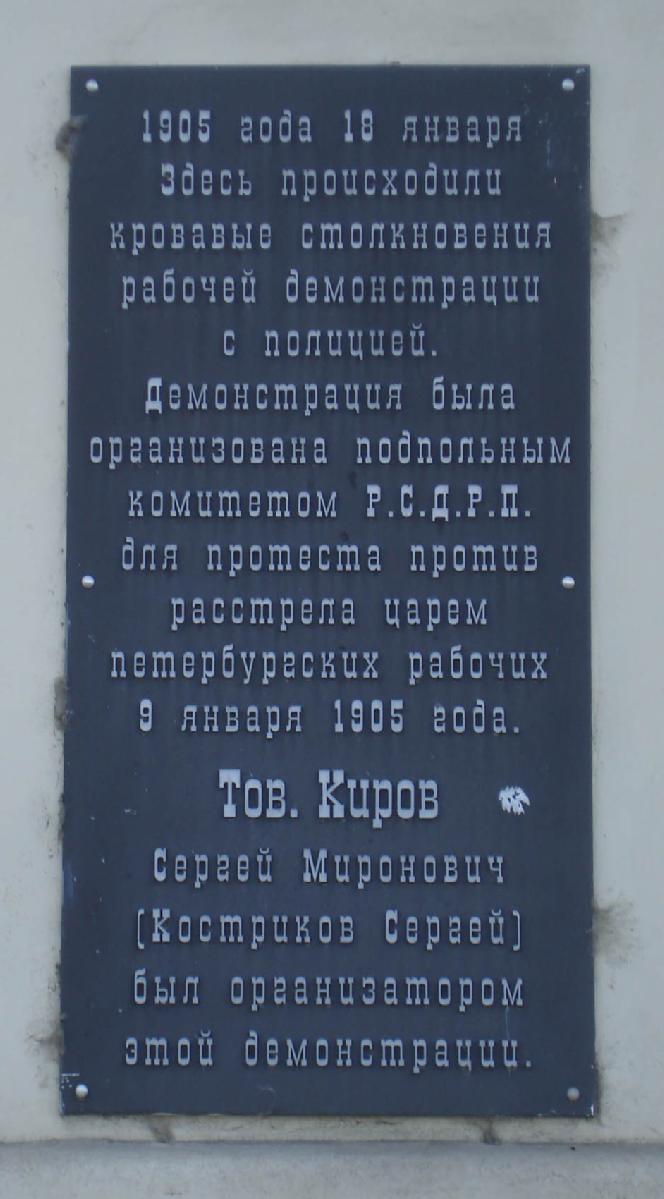 «1905 года 18 января. Здесь происходили кровавые столкновения рабочей демонстрации с полицией. Демонстрация была организована подпольным комитетом Р.С.Д.Р.П. для протеста против расстрела царем петербургских рабочих 9 января 1905 года. Тов. Киров Сергей Миронович (Костриков Сергей) был организатором этой демонстрации».