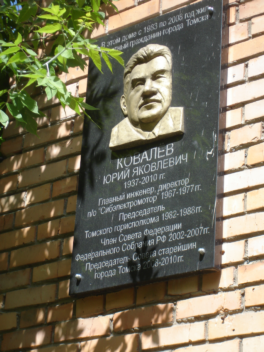 «В этом доме с 1983 по 2008 год жил Почётный гражданин города Томска Ковалев Юрий Яковлевич. 1937-2010 гг. Главный инженер, директор п/о «Сибэлектромотор», 1967-1977 гг. Председатель Томского горисполкома, 1982-1988 гг. Член Совета Федерации Федерального Собрания РФ 2002-2007 гг. Председатель Совета старейшин города Томска 2008-2010 гг.»