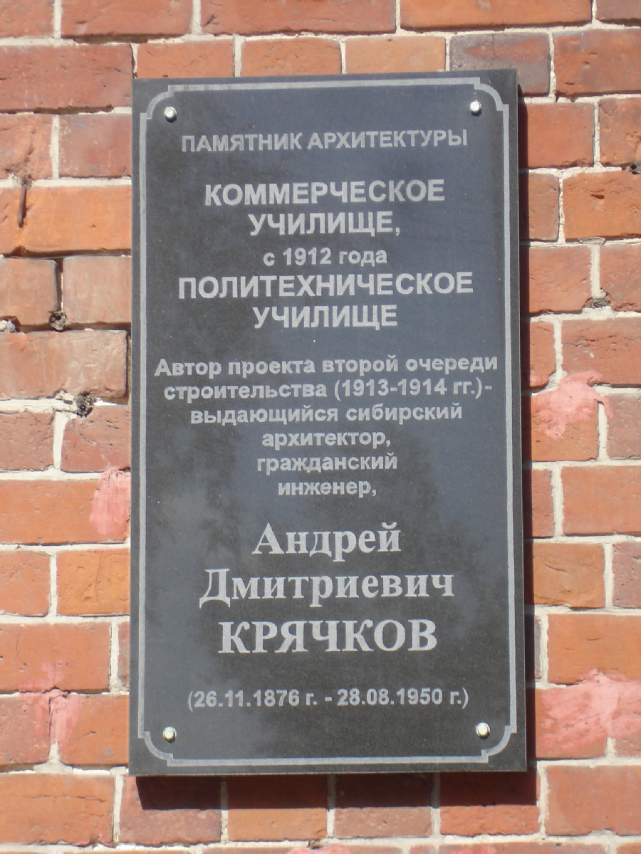 «Памятник архитектуры. Коммерческое училище, с 1912 года Политехническое училище. Автор проекта второй очереди строительства (1913-1914 гг.) – выдающийся сибирский архитектор, гражданский инженер Андрей Дмитриевич Крячков (26.11.1876 г. – 28.08.1950 г.)»