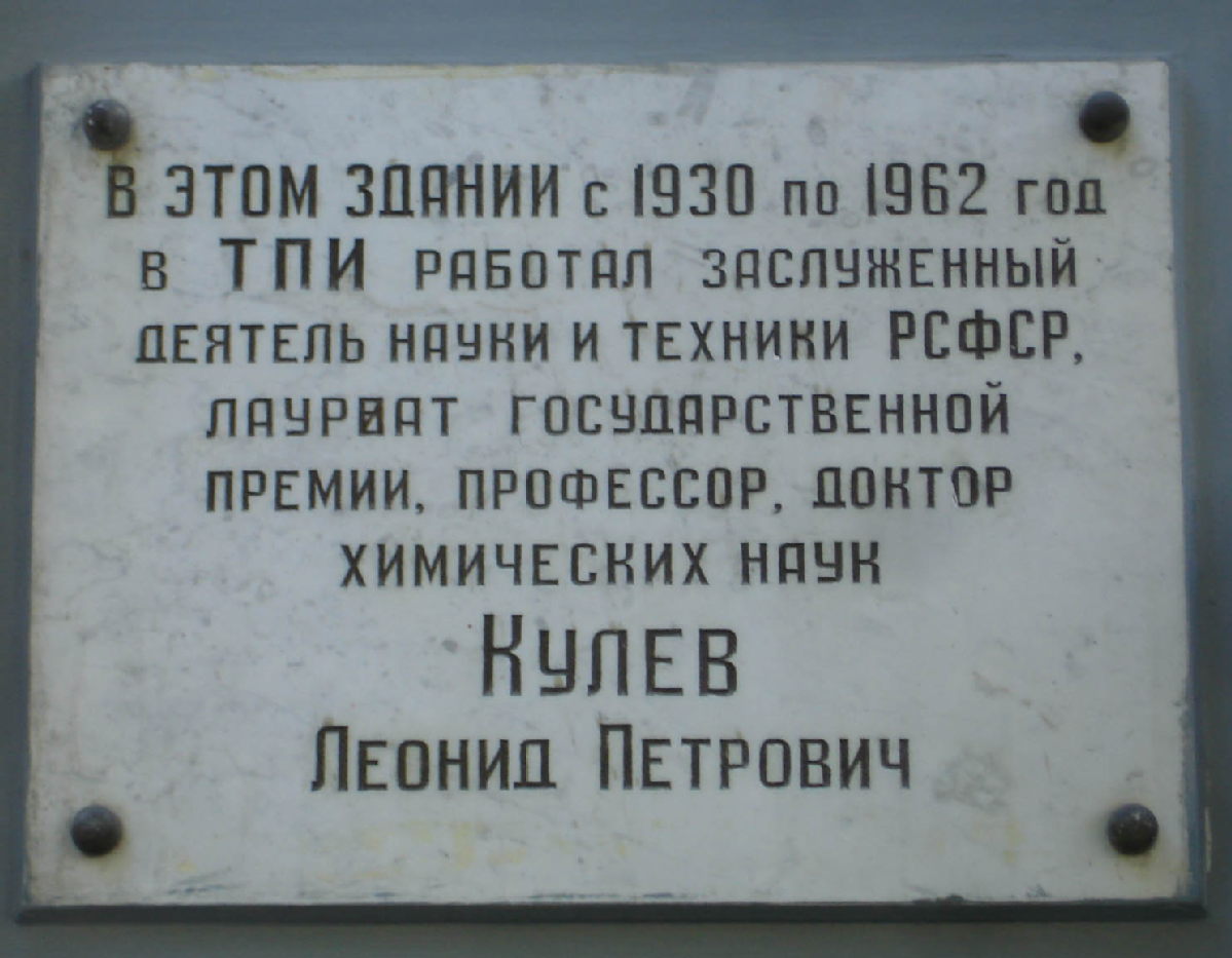 Открыта: между 1962-1966. Мрамор. Краткий текст«В этом здании с 1930 по 1962 год в ТПИ работал заслуженный деятель науки и техники РСФСР, лауреат Государственной премии, профессор, доктор химических наук Кулев Леонид Петрович»
