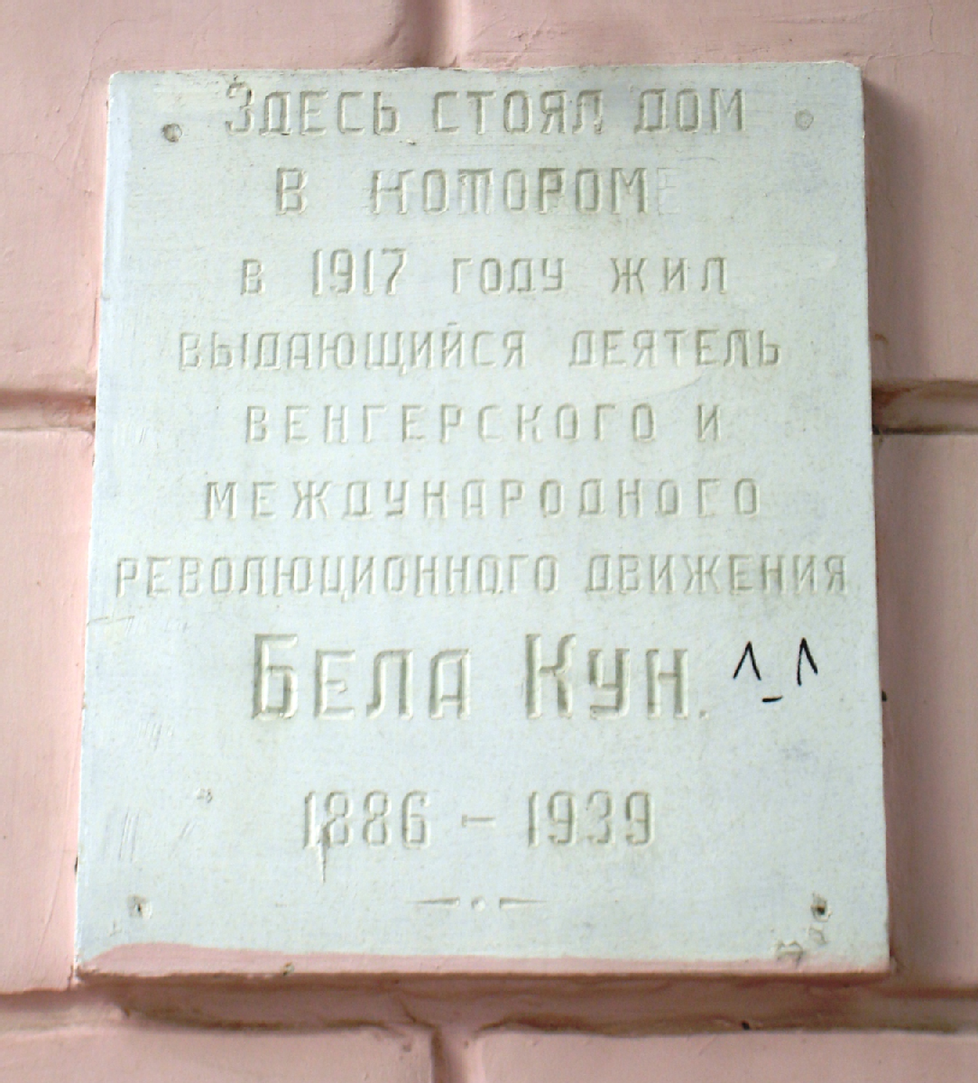 «Здесь стоял дом, в котором в 1917 году жил выдающийся деятель венгерского и международного революционного движения Бела Кун. 1886-1939»
