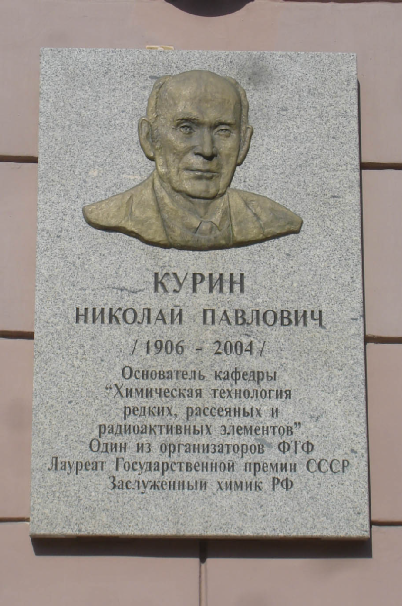 Открыта:15 декабря 2006. Гранит, бронза, барельеф (портрет).«Курин Николай Павлович /1906-2004/. Основатель кафедры «Химическая технология редких, рассеянных и радиоактивных элементов»». Один из организаторов ФТФ. Лауреат Государственной премии СССР. Заслуженный химик РФ»