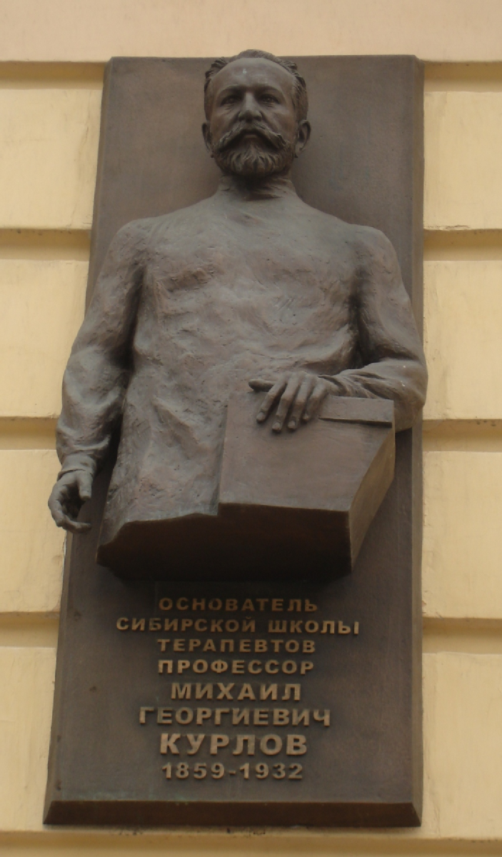Автор: скульптор Н.П. Гнедых. Бронза, горельеф. Краткий текст«Основатель сибирской школы терапевтов профессор Михаил Георгиевич Курлов. 1859-1932»