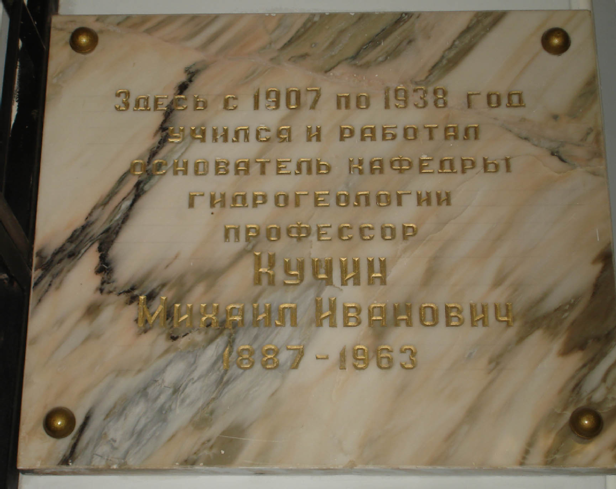 «Здесь с 1907 по 1938 год учился и работал основатель кафедры гидрогеологии, профессор Кучин Михаил Иванович. 1887-1963»