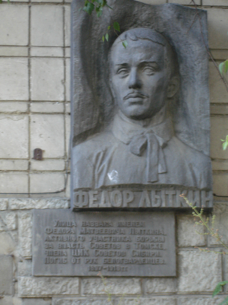 Открыта: ноябрь 1987. Металл, горельеф.«Федор Лыткин. Улица названа именем Федора Матвеевича Лыткина, активного участника борьбы за власть Советов в Томске, члена ЦИК Советов Сибири. Погиб от рук белогвардейцев. 1897-1918 гг.»