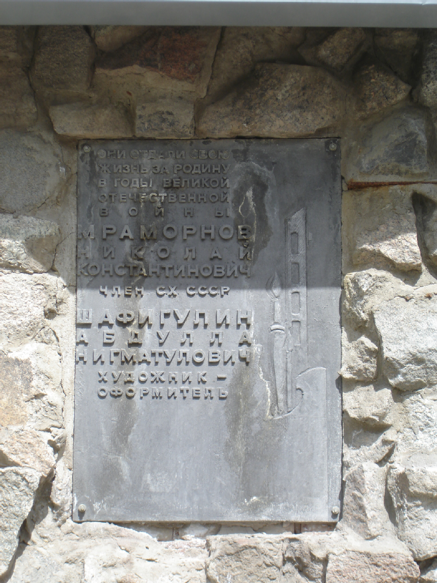Открыта: 7 ноября 2006. Металл, барельеф.«Они отдали свою жизнь за Родину в годы Великой Отечественной войны. Мраморнов Николай Константинович, член СХ СССР. Шафигулин Абдулла Нигматулович, художник-оформитель»